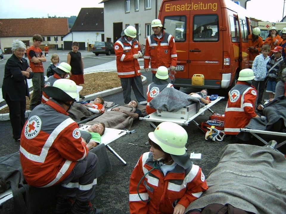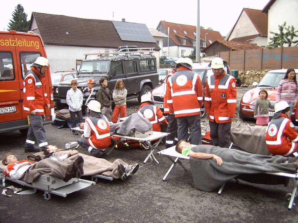 In einem Mehrfamilienhaus war es zu einem Brand in der Garage gekommen, infolge dessen das Treppenhaus des Gebäudes verraucht wurde. Insgesamt 6 Verletzte mit verschiedenen Verletzungsmustern wurden von der Feuerwehr zum Teil über die Drehleiter gerettet und vom DRK zur weiteren Behandlung übernommen. Dabei galt es, Knochenbrüche zu versorgen, Brandwunden zu verbinden und Rauchvergiftungen zu behandeln.